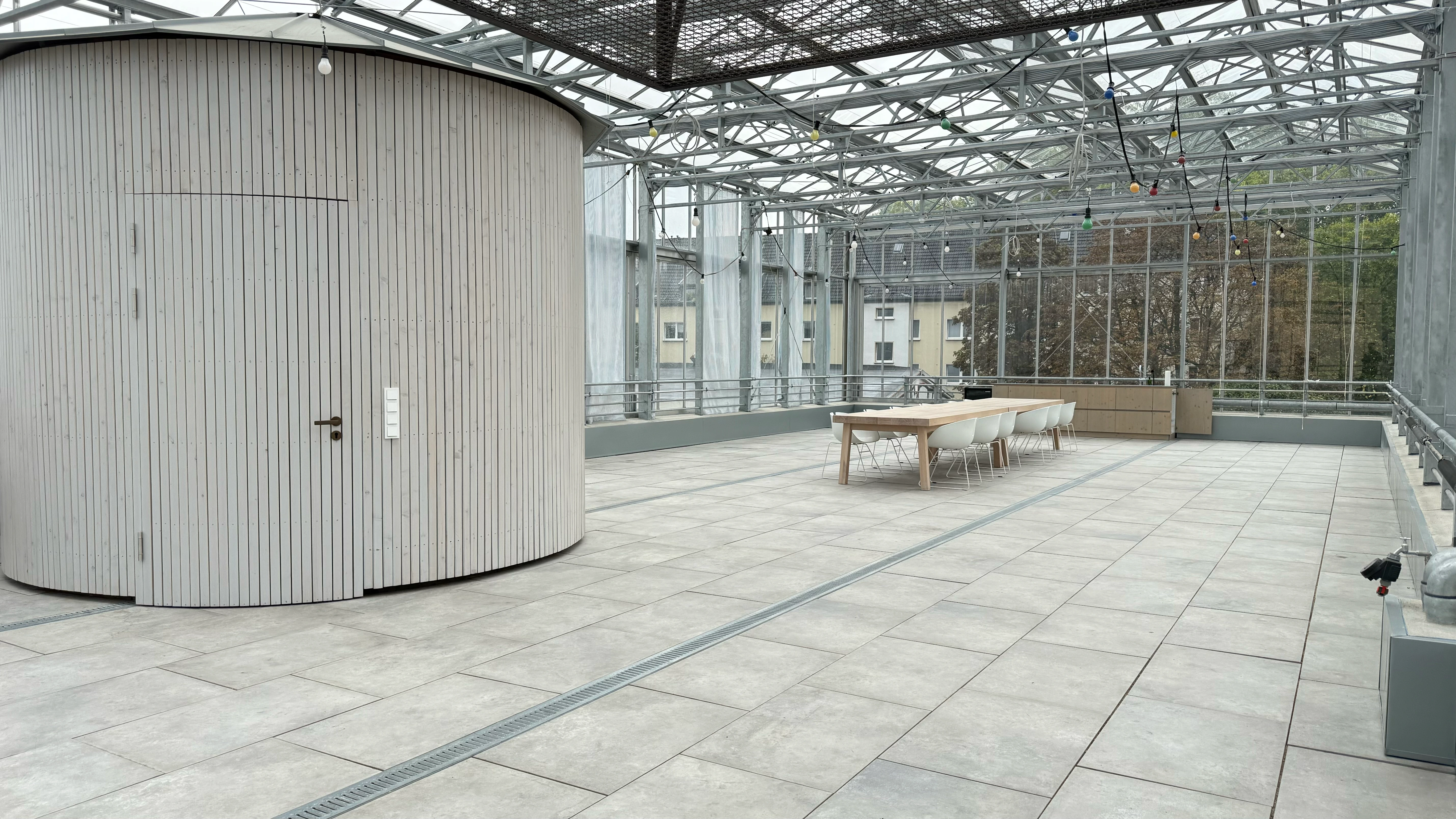 Oberhalb des Bestands eröffnet eine neue architektonische Schicht in Form einer gläsernen Haube einen Möglichkeitsraum in der Stadt. Einfach konstruiert, in der Form eines standardisierten Gewächshauses, versteht sich der Raum als Angebot für unterschiedliche Veranstaltungsformate & Ausstellungen.